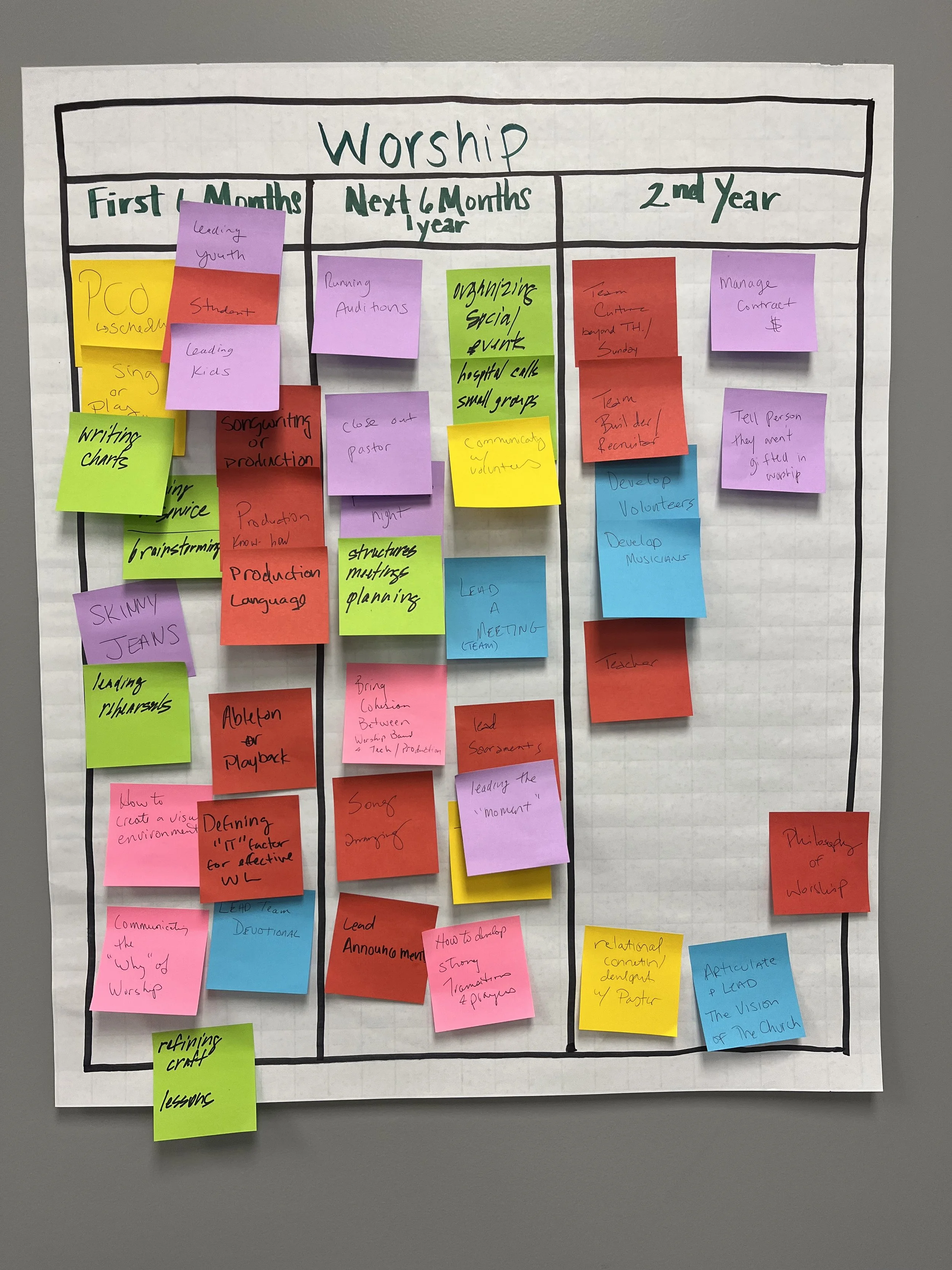As you’ll see in this example, a worship resident begins in the first six months with simple tasks like scheduling the team in Planning Center. This progresses to running auditions in the second column until eventually, before the completion of residency, there’s a task called “telling a person he/she isn’t gifted in worship.”